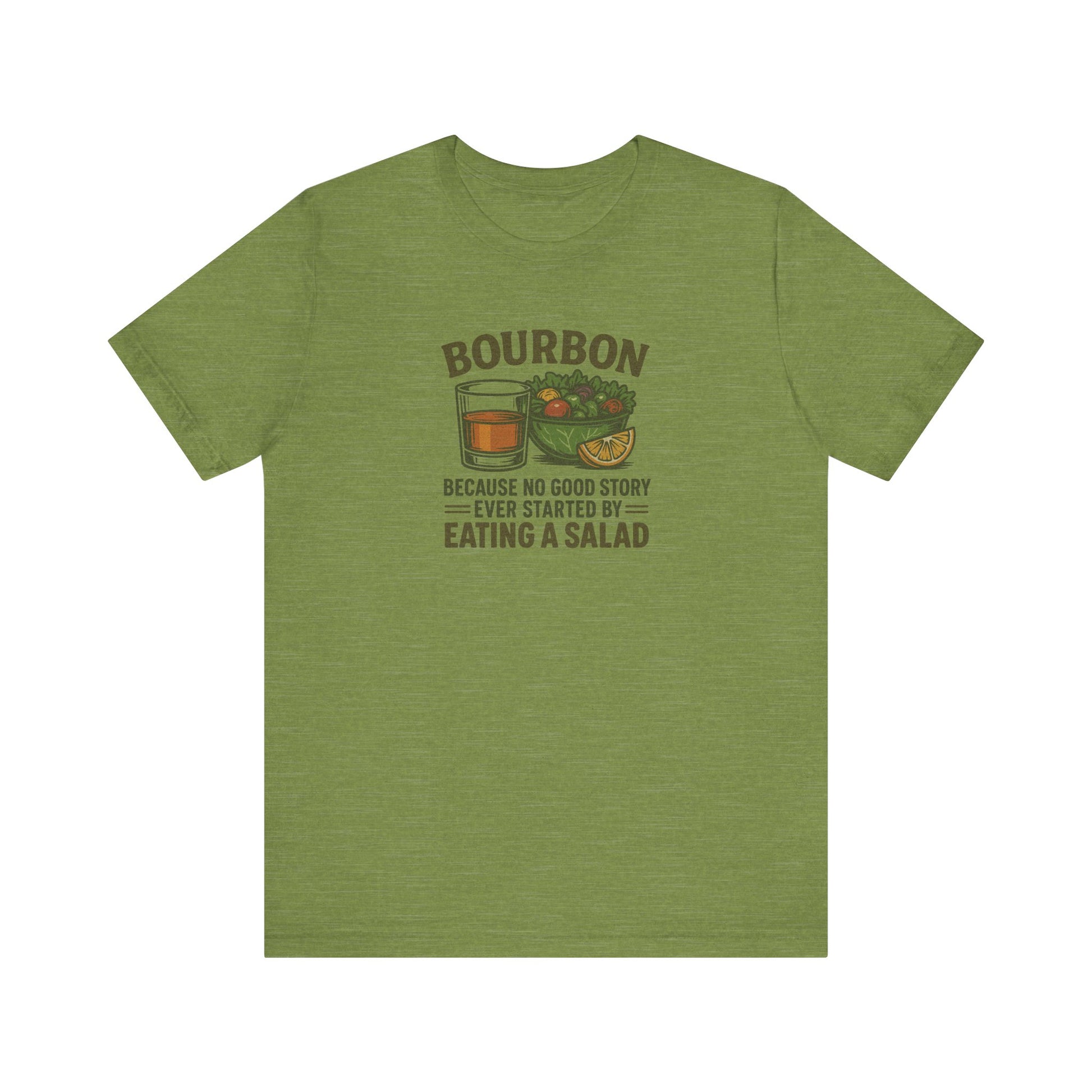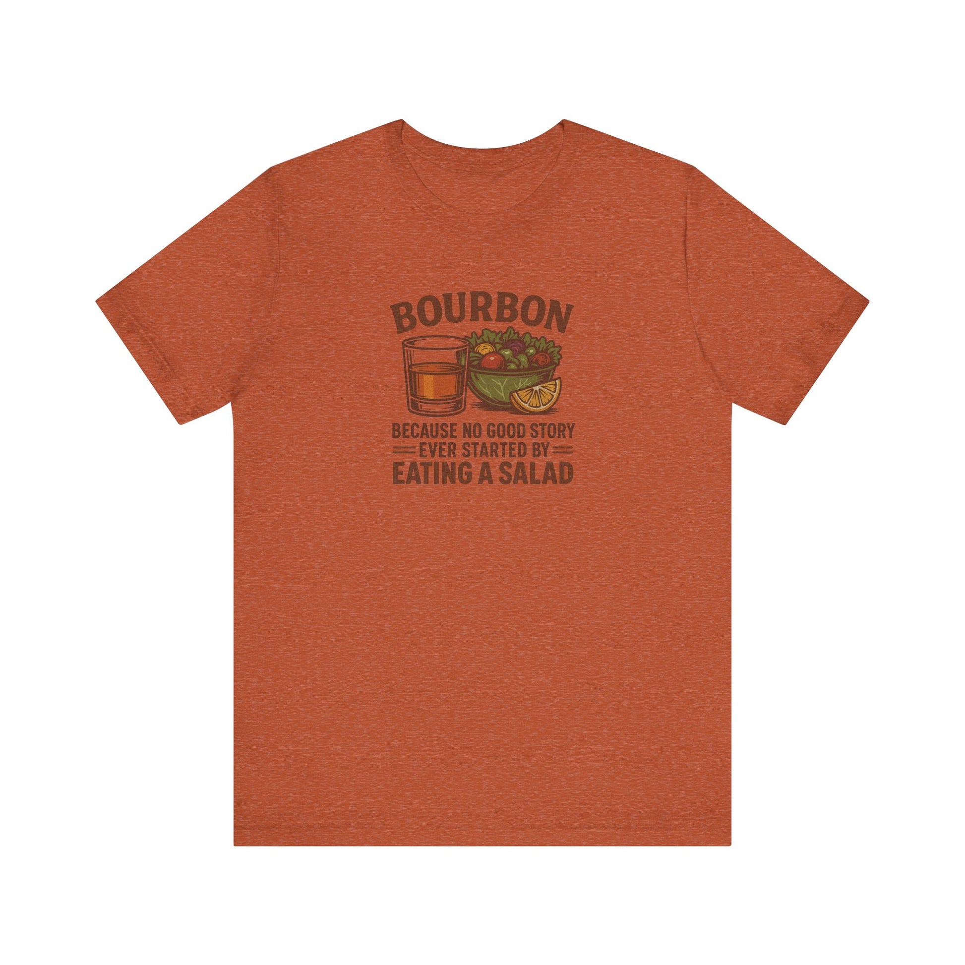 A bold reminder that salad rarely leads to unforgettable nights. This retro-style design features a perfectly poured bourbon and a smug little salad, because we all know which one actually starts the story. Designed with vintage-inspired colors and subtle texture for a smooth, timeworn finish.