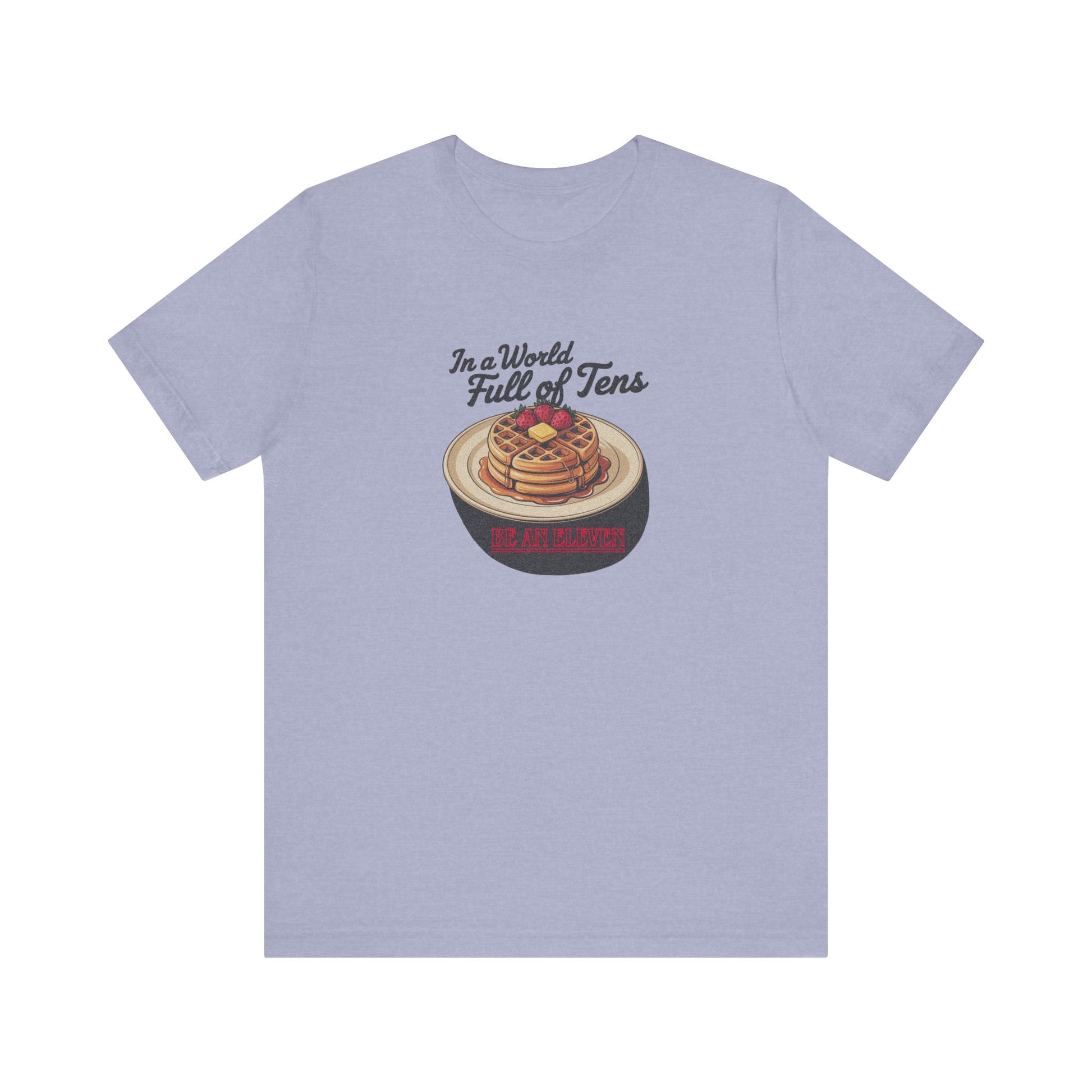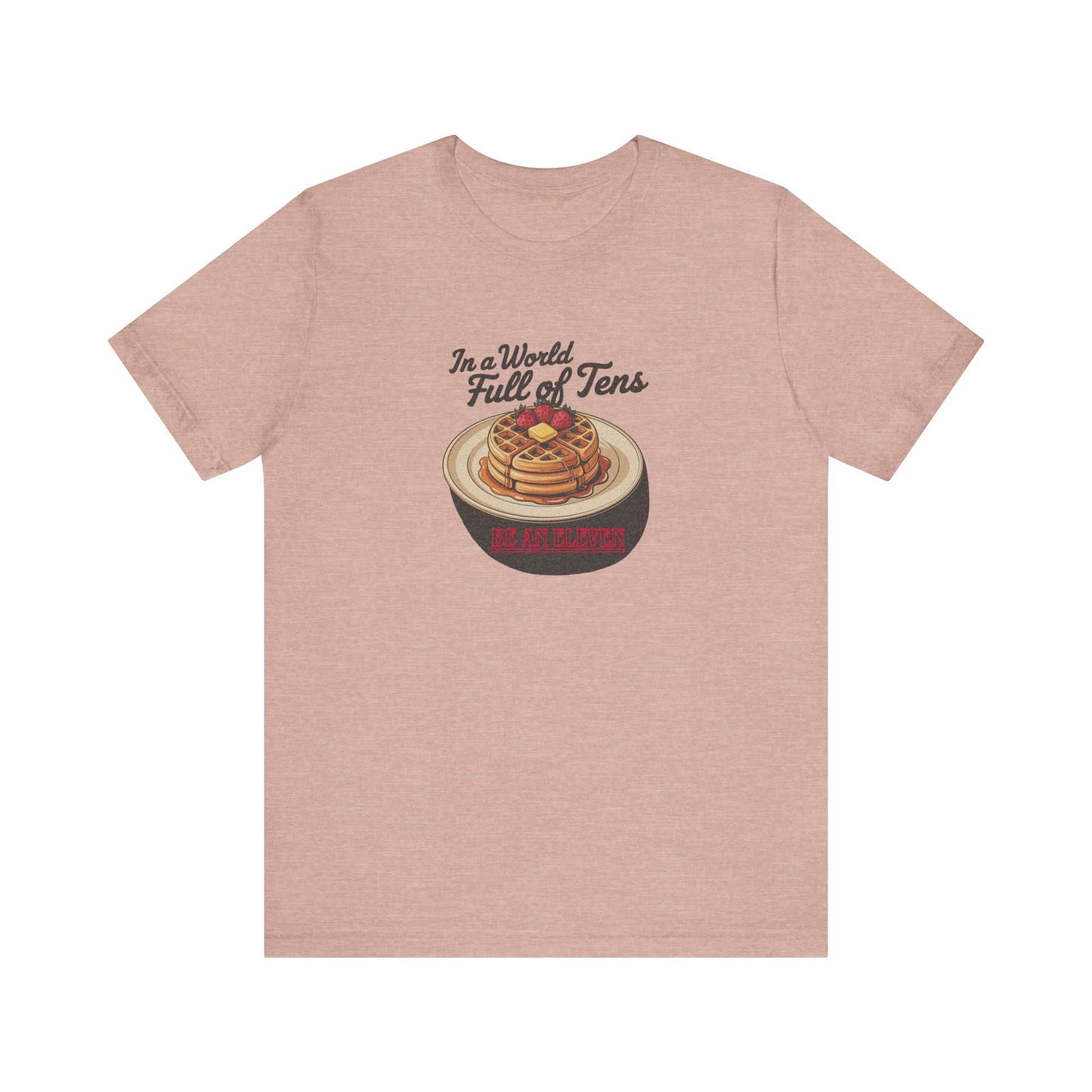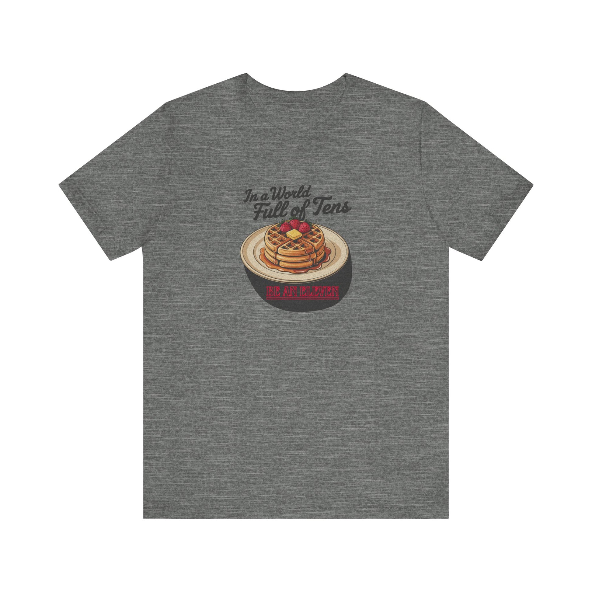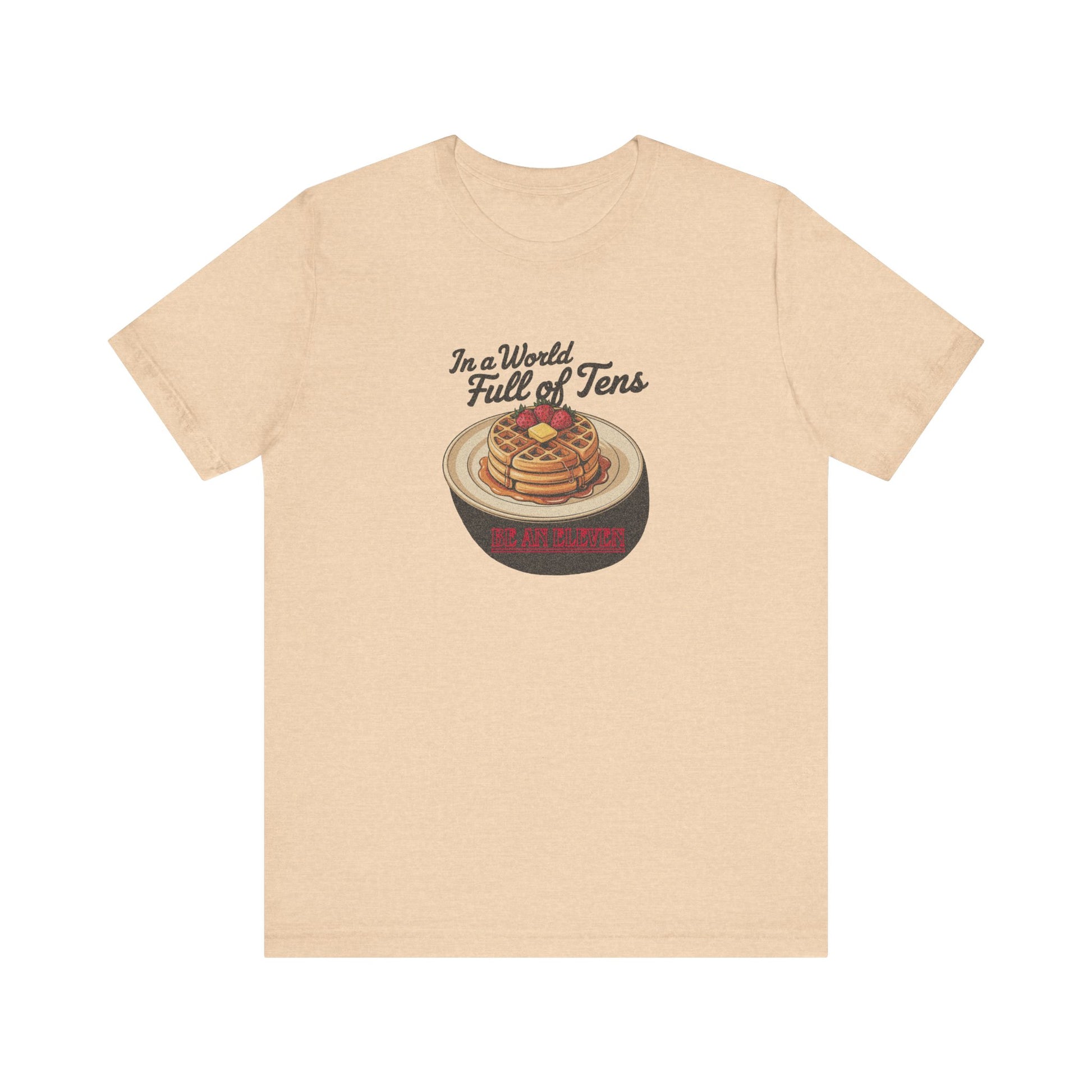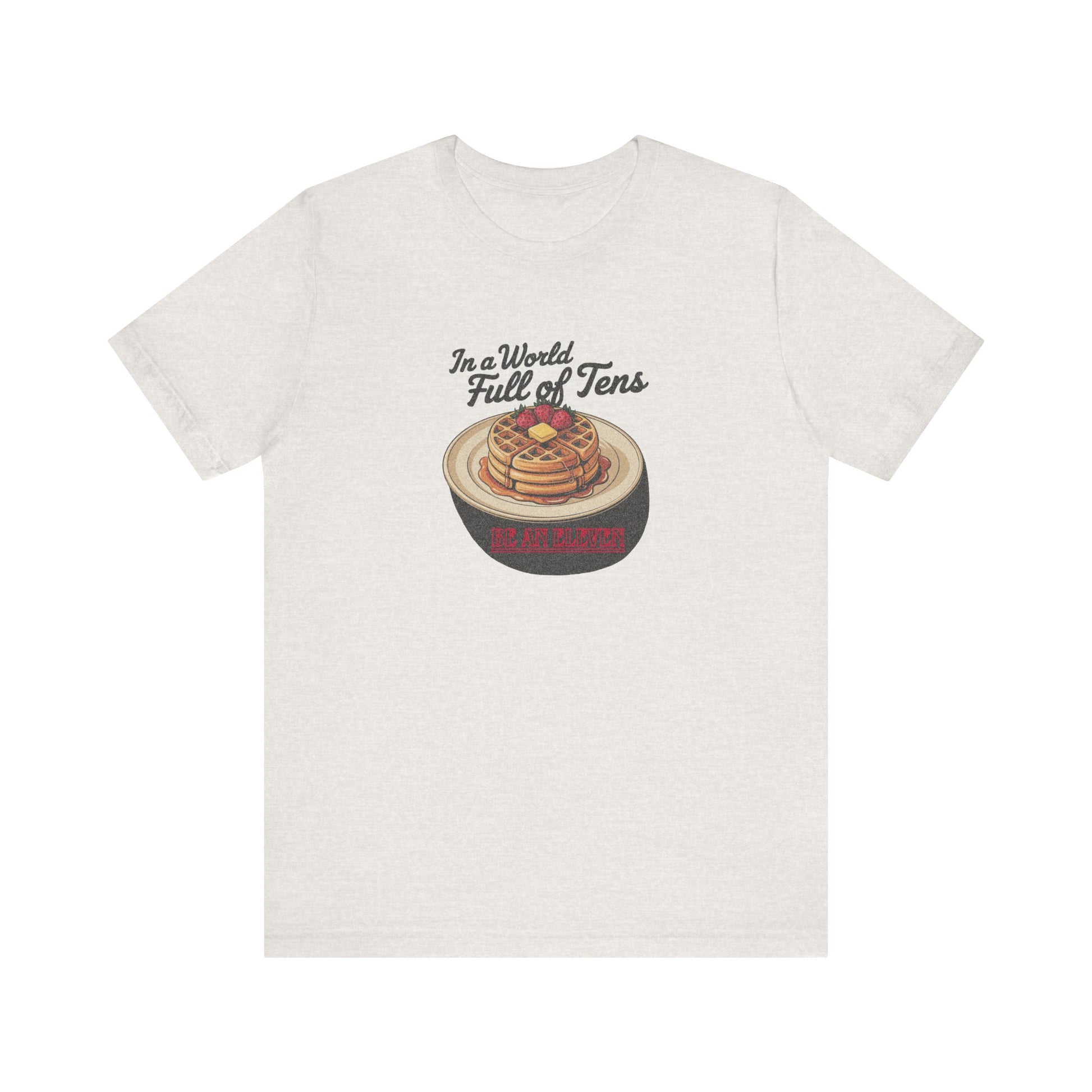 This one goes up to Eleven. This tee is stacked with layered meaning and waffles. A tribute to Stranger Things’ telekinetic powerhouse and her favorite frozen snack, the design blends vintage breakfast vibes with the eerie glow of Hawkins, Indiana. Featuring title-style typography and syrupy goodness, it’s for anyone who aims to stand out on purpose.