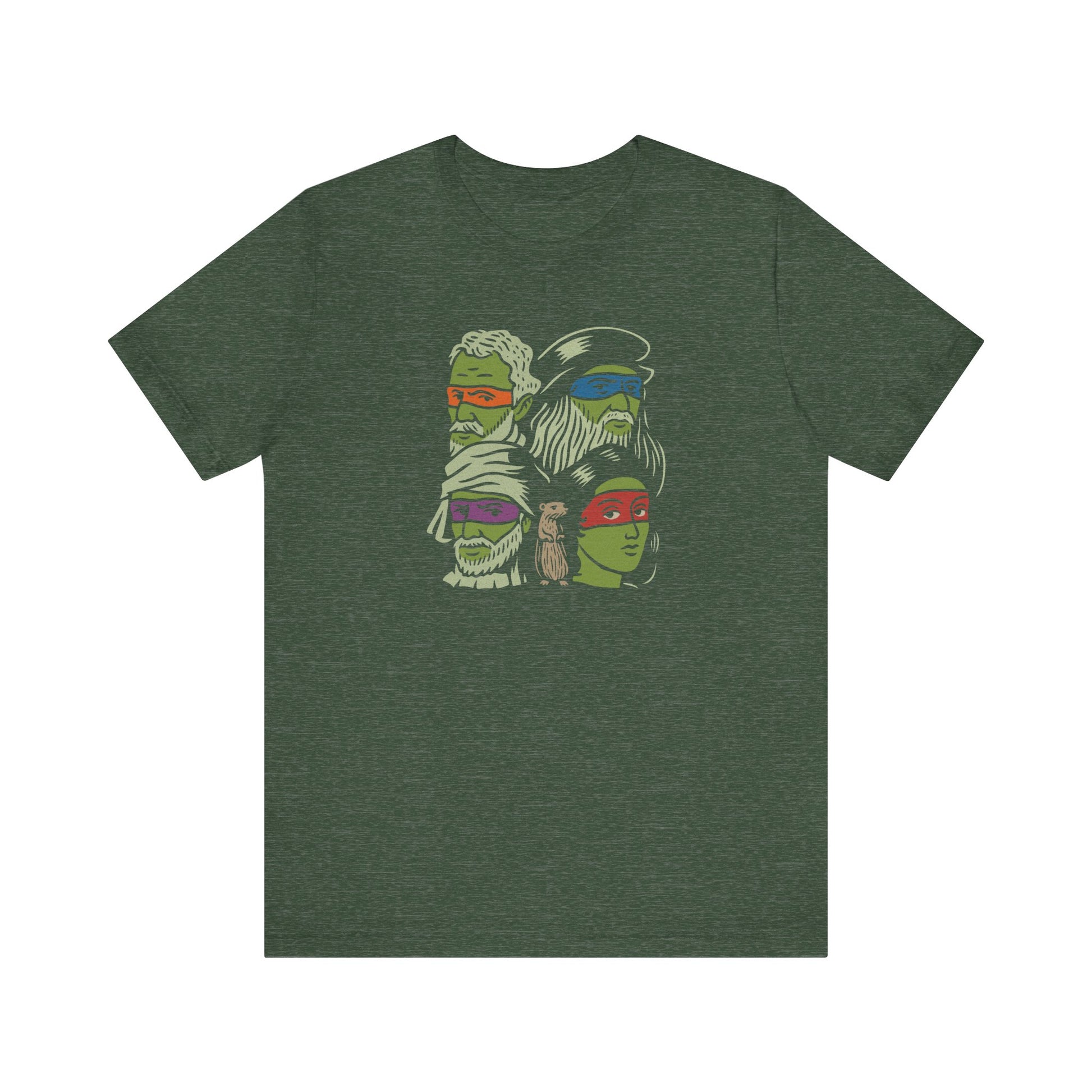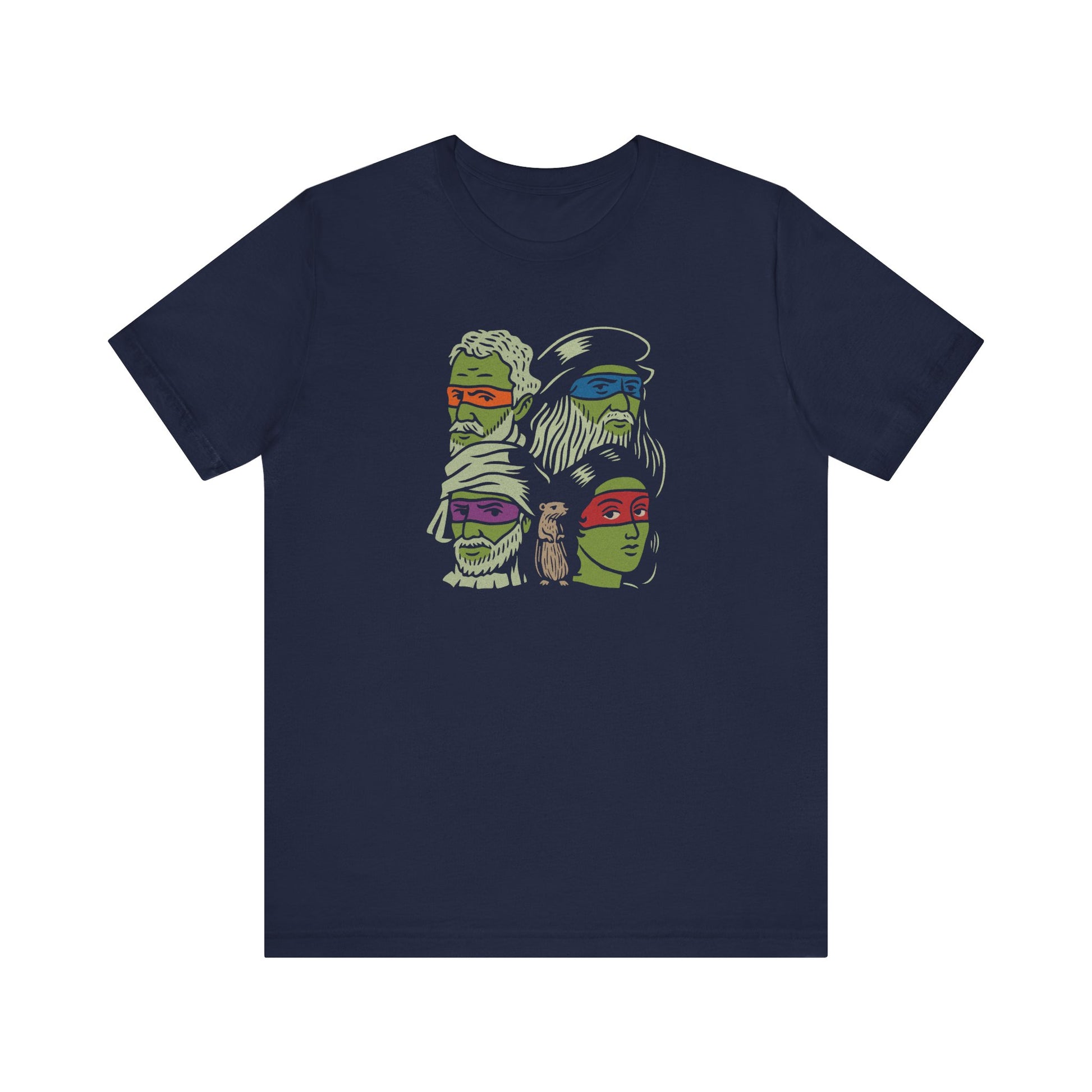 Fine art meets sewer squad. This design flips the script on the Teenage Mutant Ninja Turtles by featuring the real Renaissance masters they’re named after. With bold eye-mask colors, hand-drawn linework, and a surprise cameo from a certain sensei rodent, it’s a brainy visual pun that bridges art history and Saturday morning cartoons. Classy, but with nunchucks.