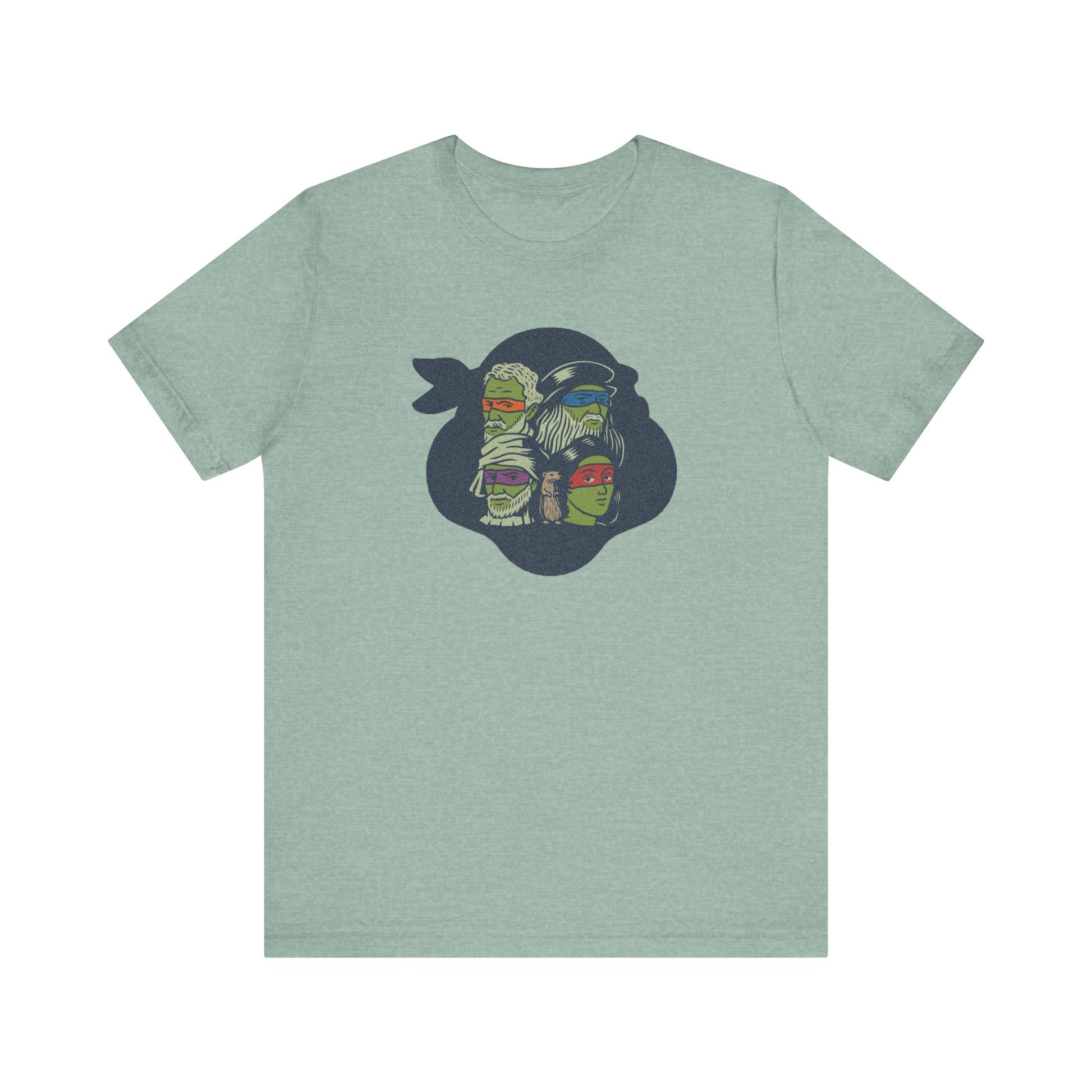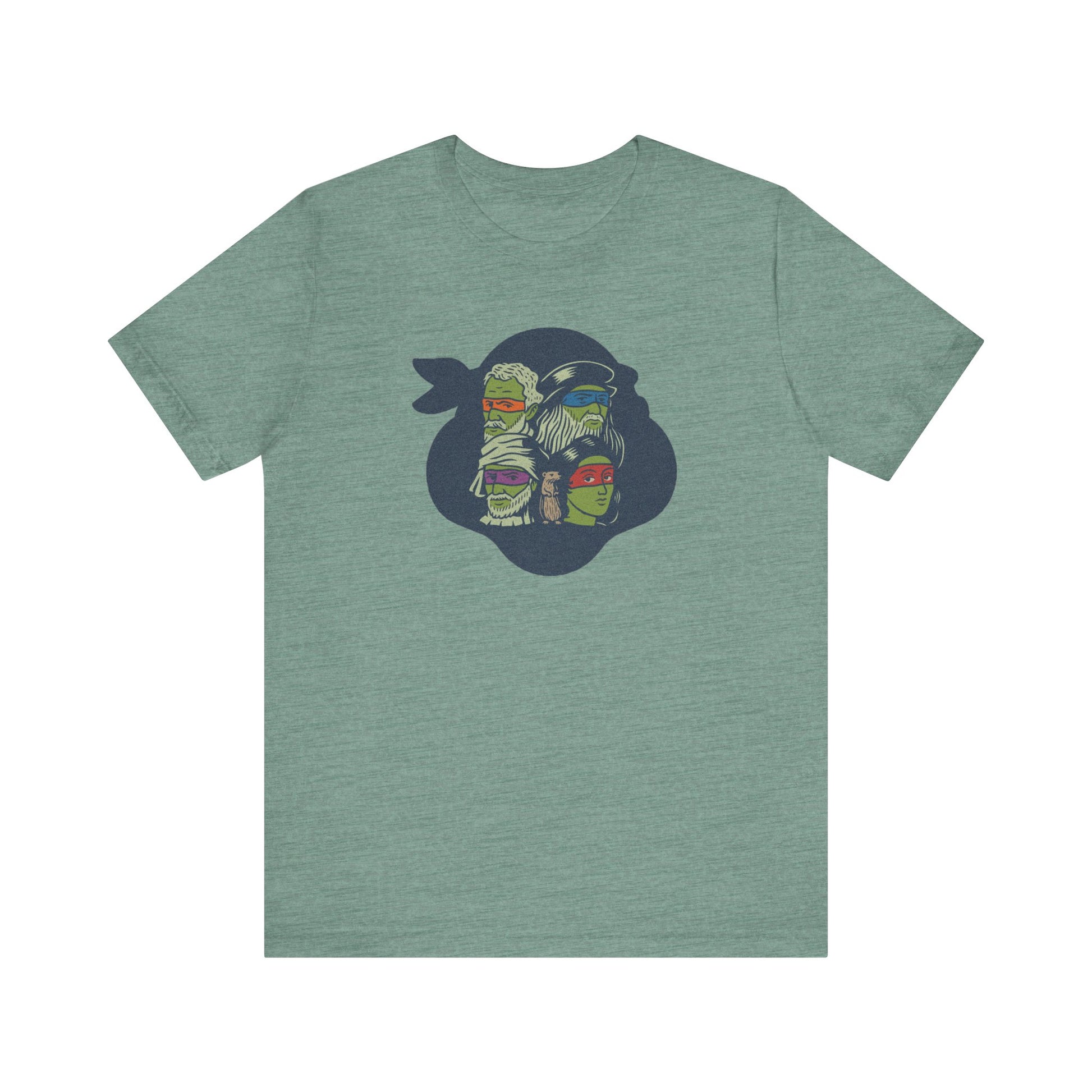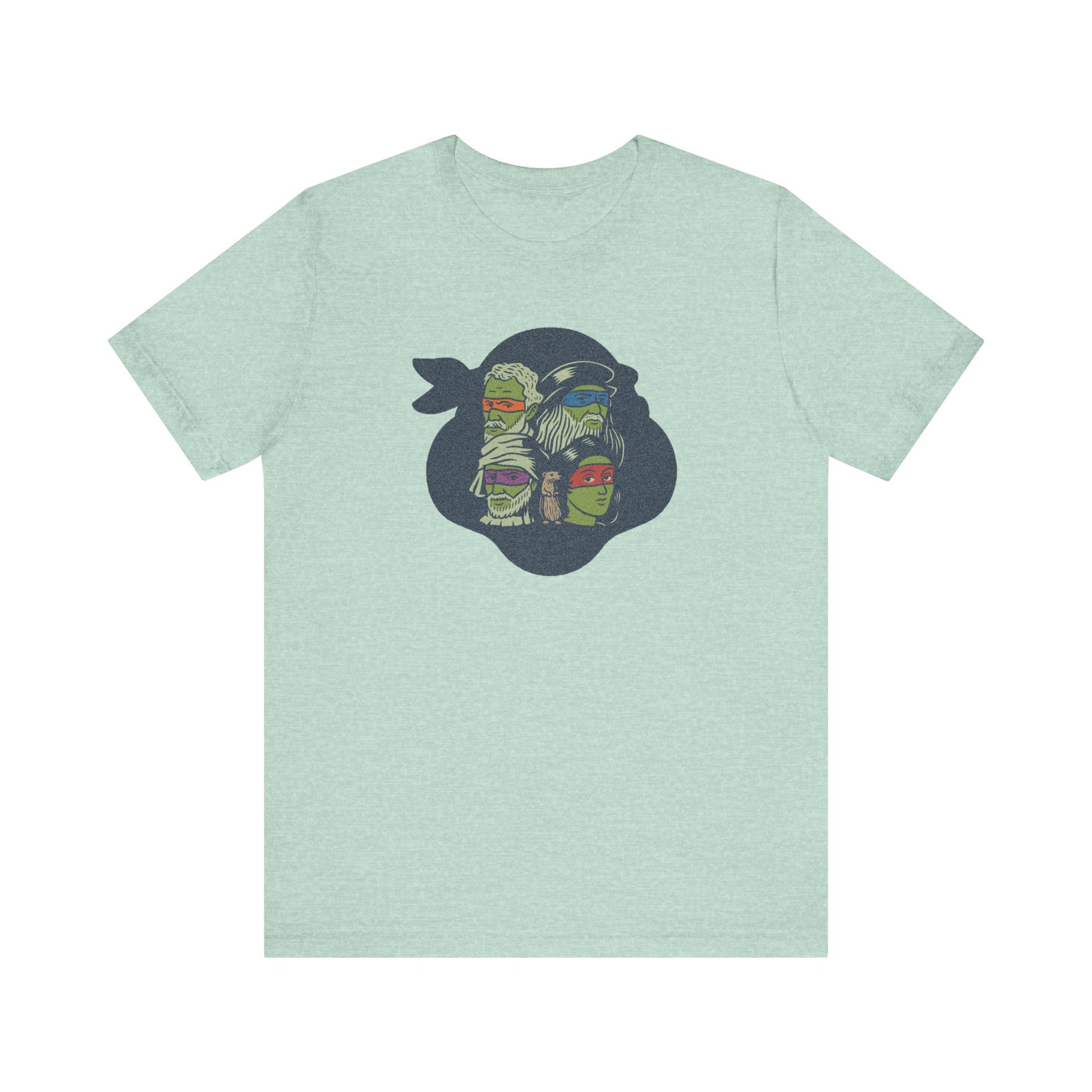 Fine art meets sewer squad. This design flips the script on the Teenage Mutant Ninja Turtles by featuring the real Renaissance masters they’re named after. With bold eye-mask colors, hand-drawn linework, and a surprise cameo from a certain sensei rodent, it’s a brainy visual pun that bridges art history and Saturday morning cartoons. Classy, but with nunchuks.