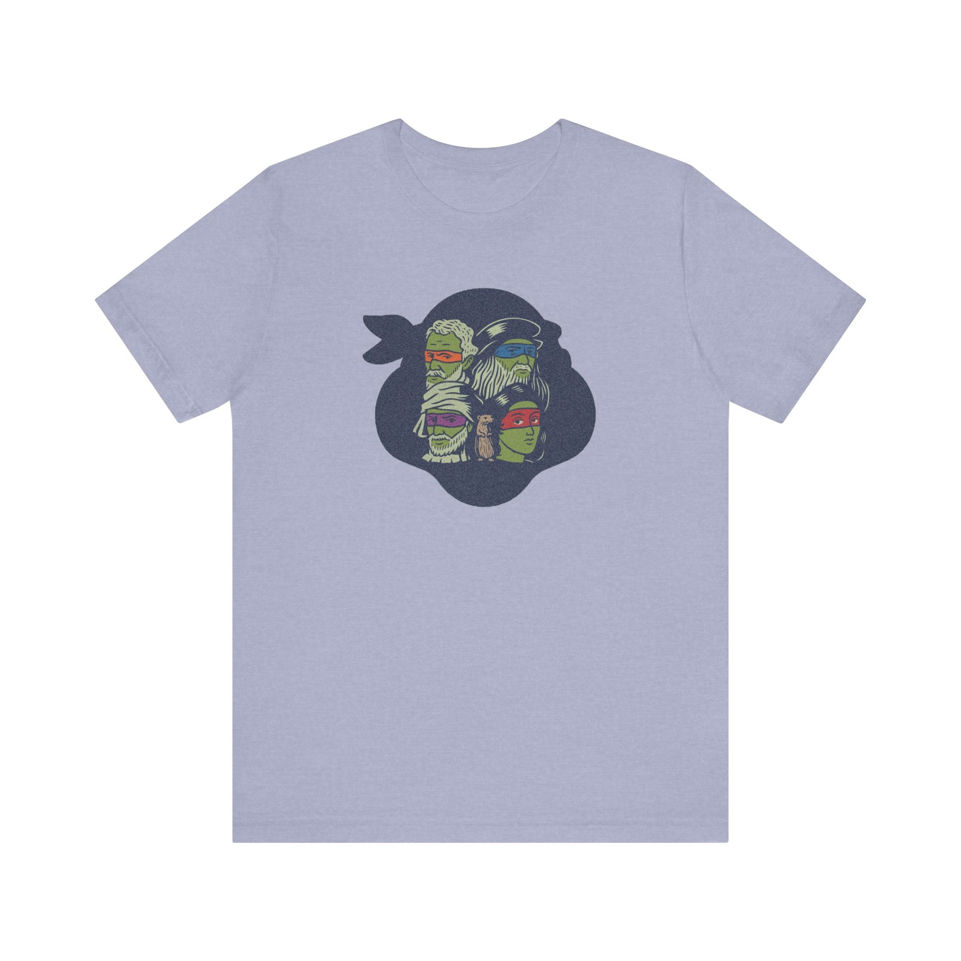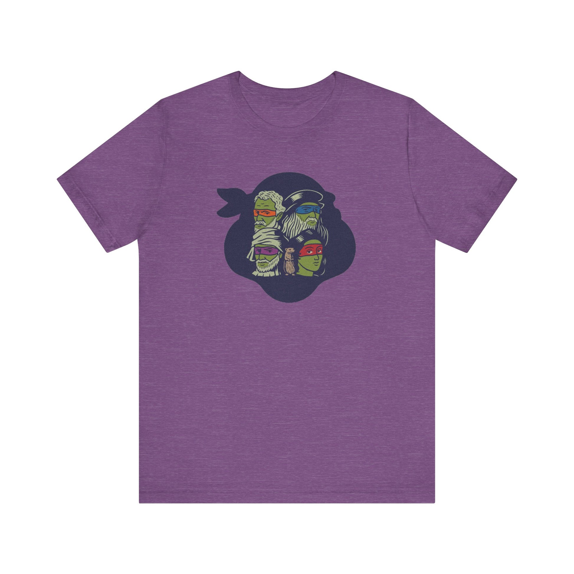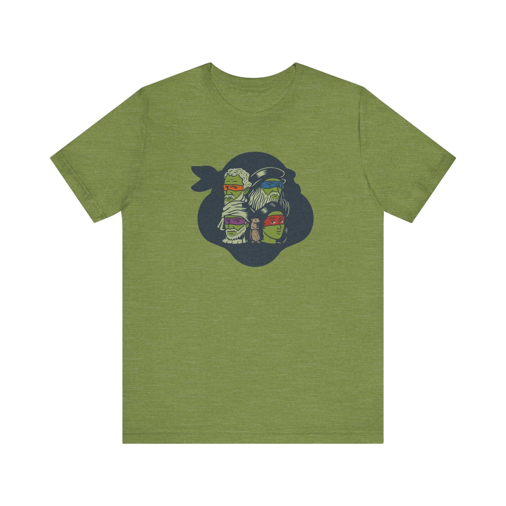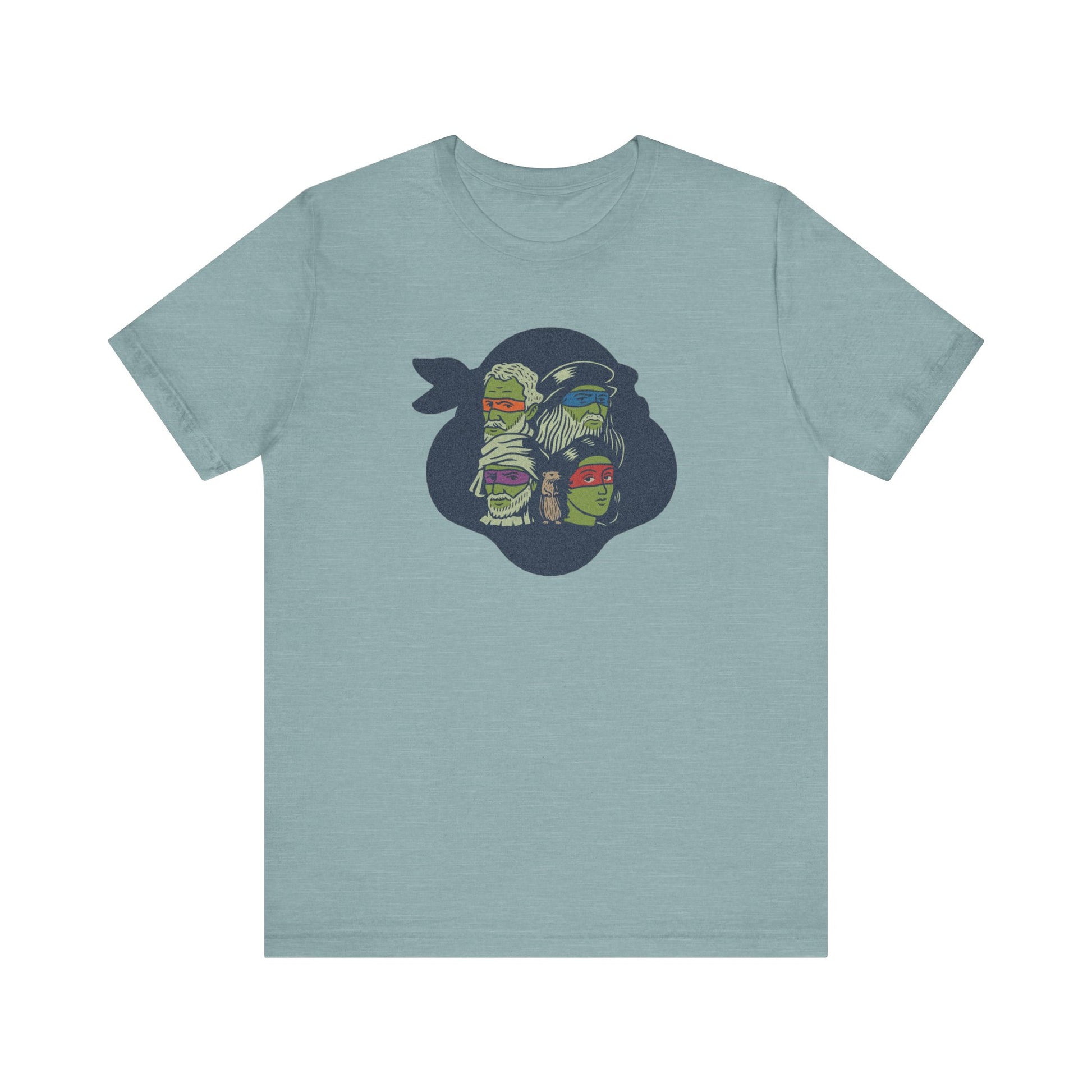 Fine art meets sewer squad. This design flips the script on the Teenage Mutant Ninja Turtles by featuring the real Renaissance masters they’re named after. With bold eye-mask colors, hand-drawn linework, and a surprise cameo from a certain sensei rodent, it’s a brainy visual pun that bridges art history and Saturday morning cartoons. Classy, but with nunchuks.