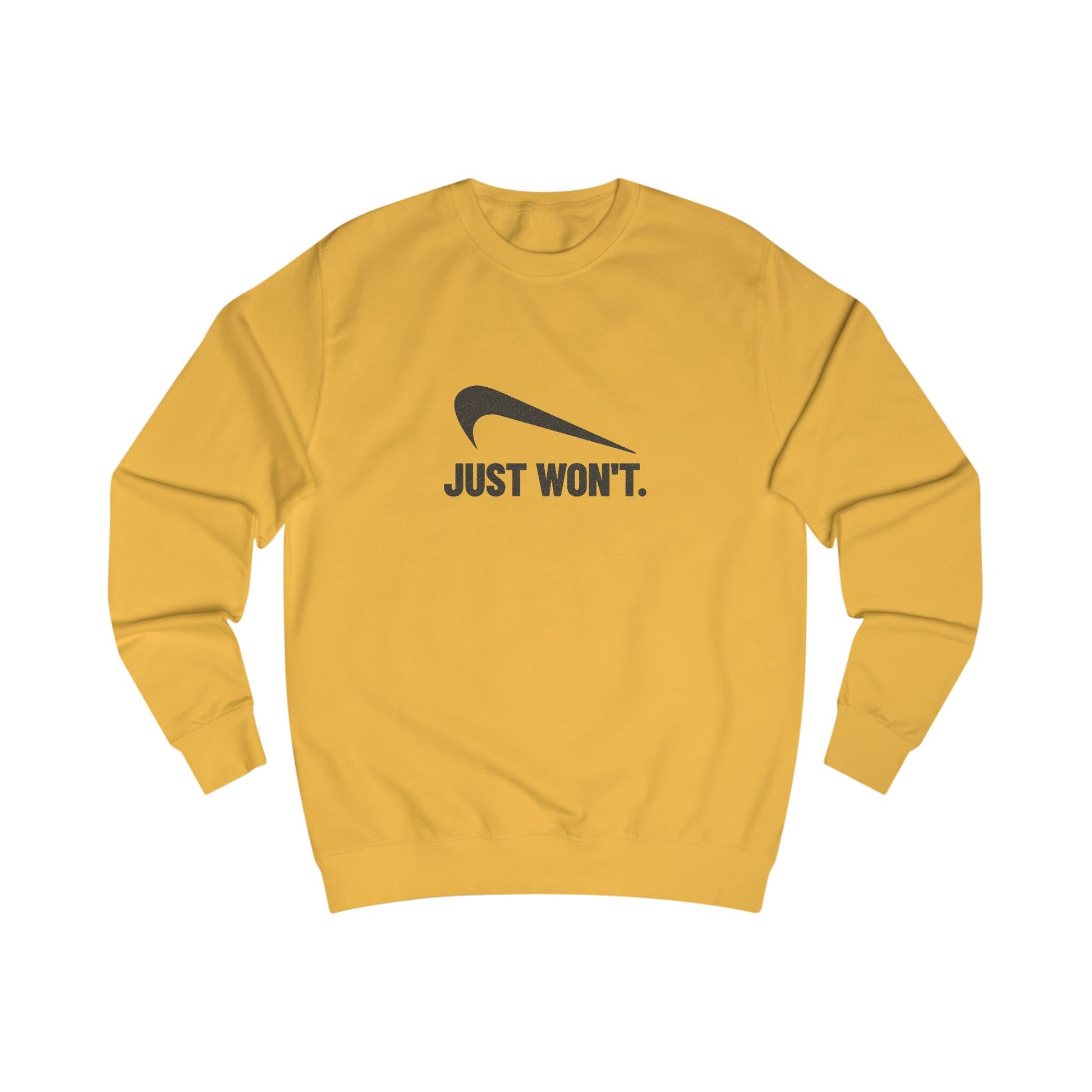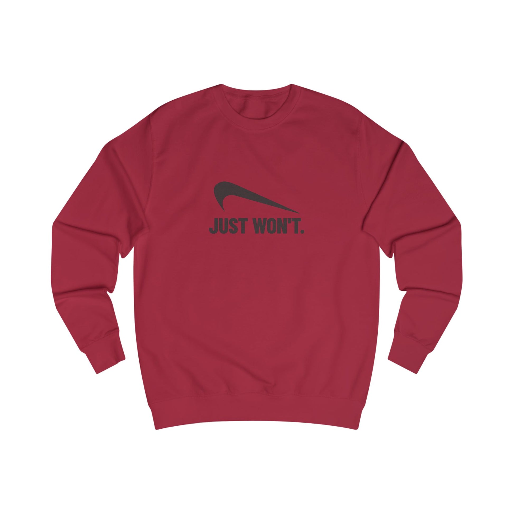 - Bold parody swoosh and “Just Won’t.” text
