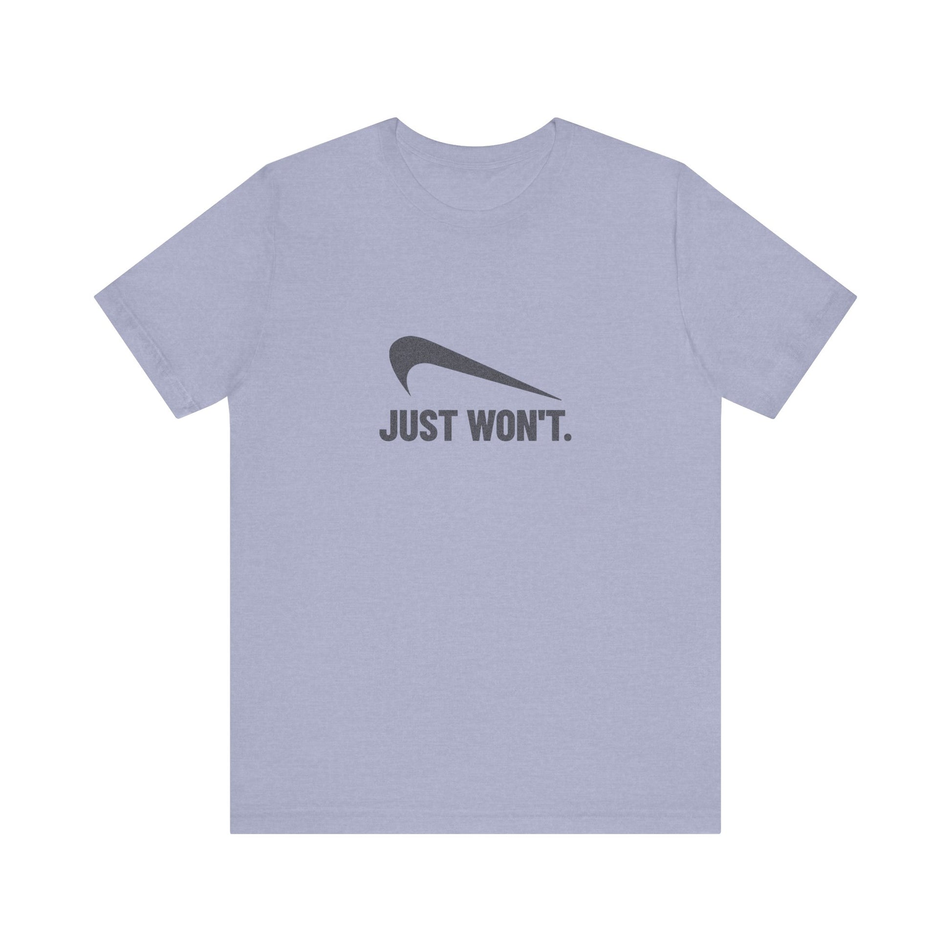 Ambition? Nope. Drive? Still nope. If you've reached the point where “can’t” has evolved into “won’t,” this design is for you. Just Won’t is the final form of “over it.” Designed for anyone who’s had enough meetings, notifications, or human interaction for one lifetime, this tee delivers peak apathy with clean retro style.