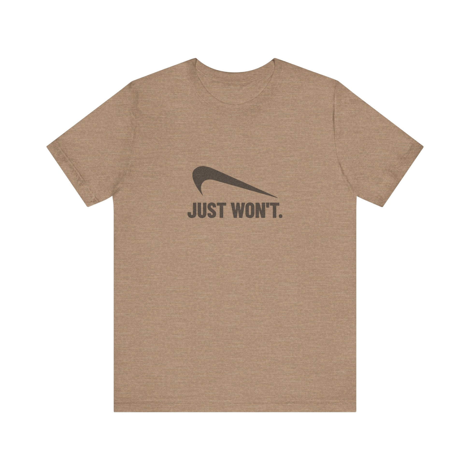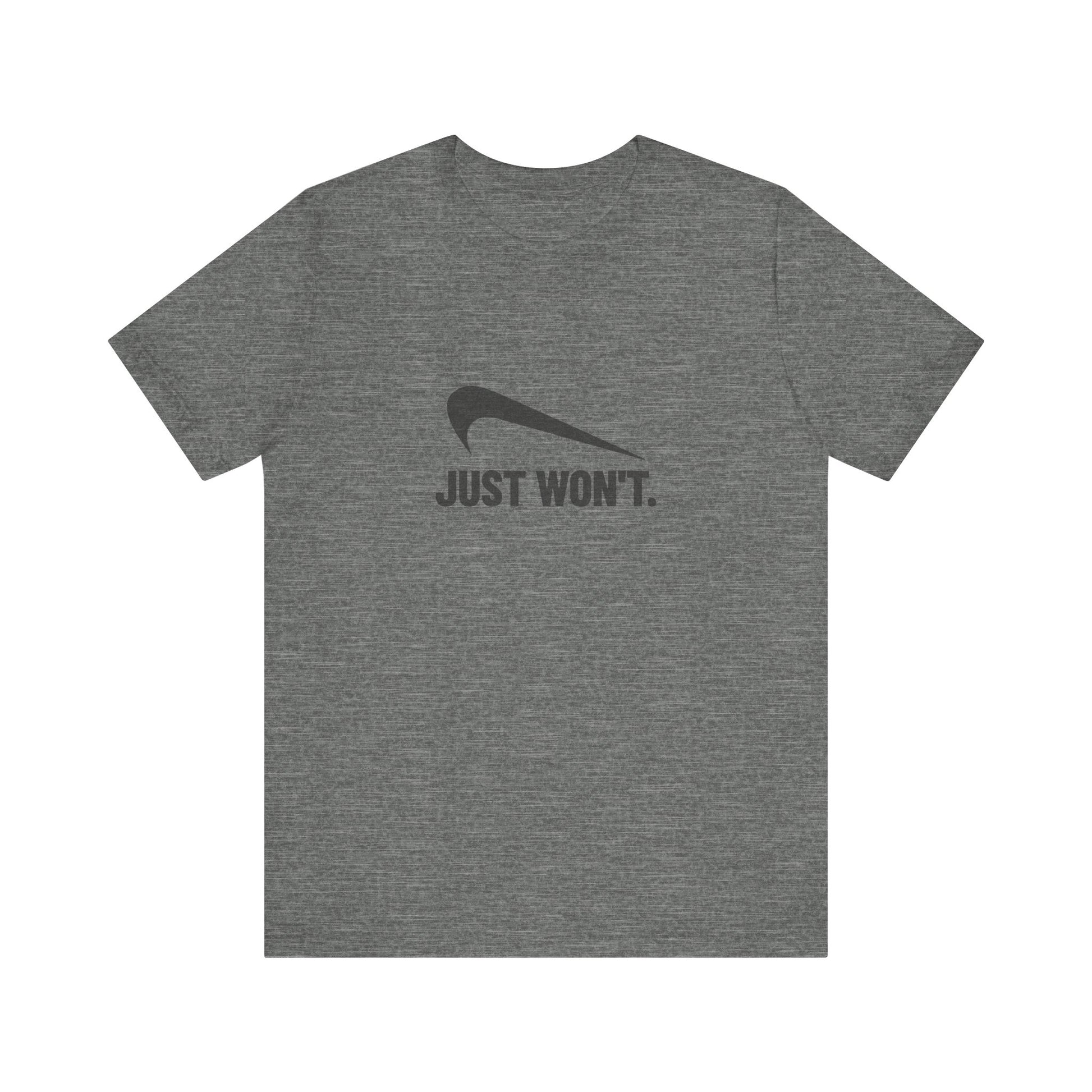 - Bold parody swoosh and “Just Won’t.” text