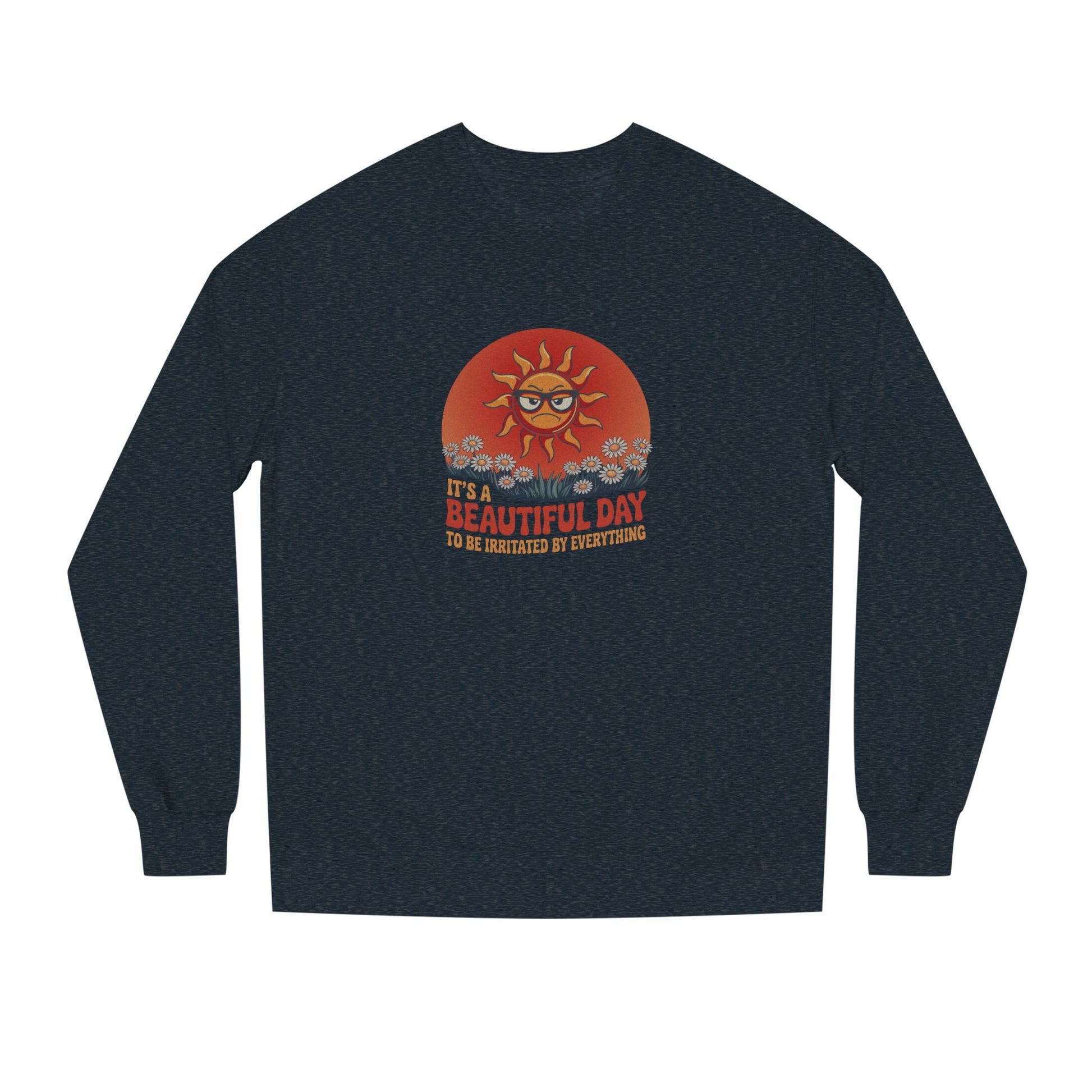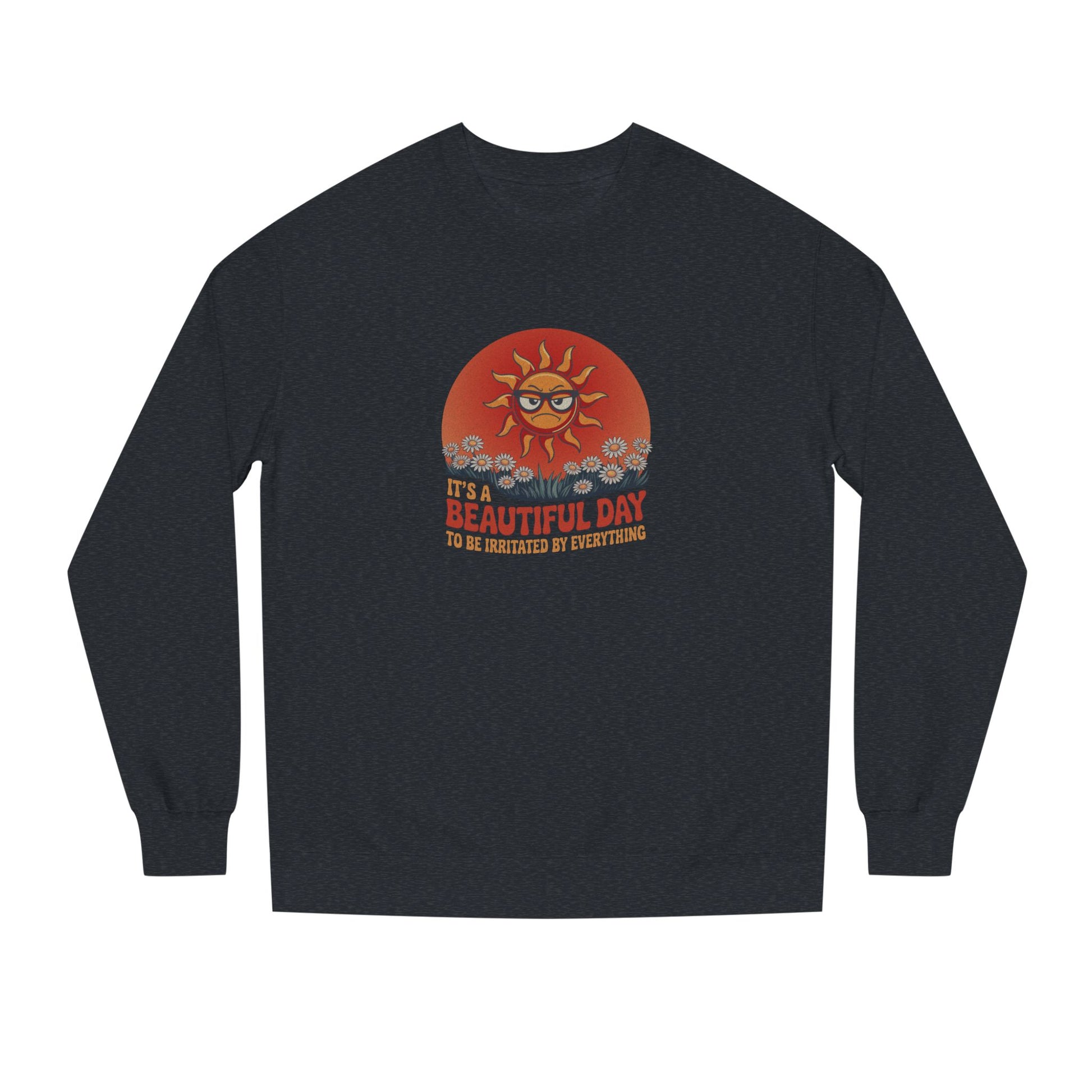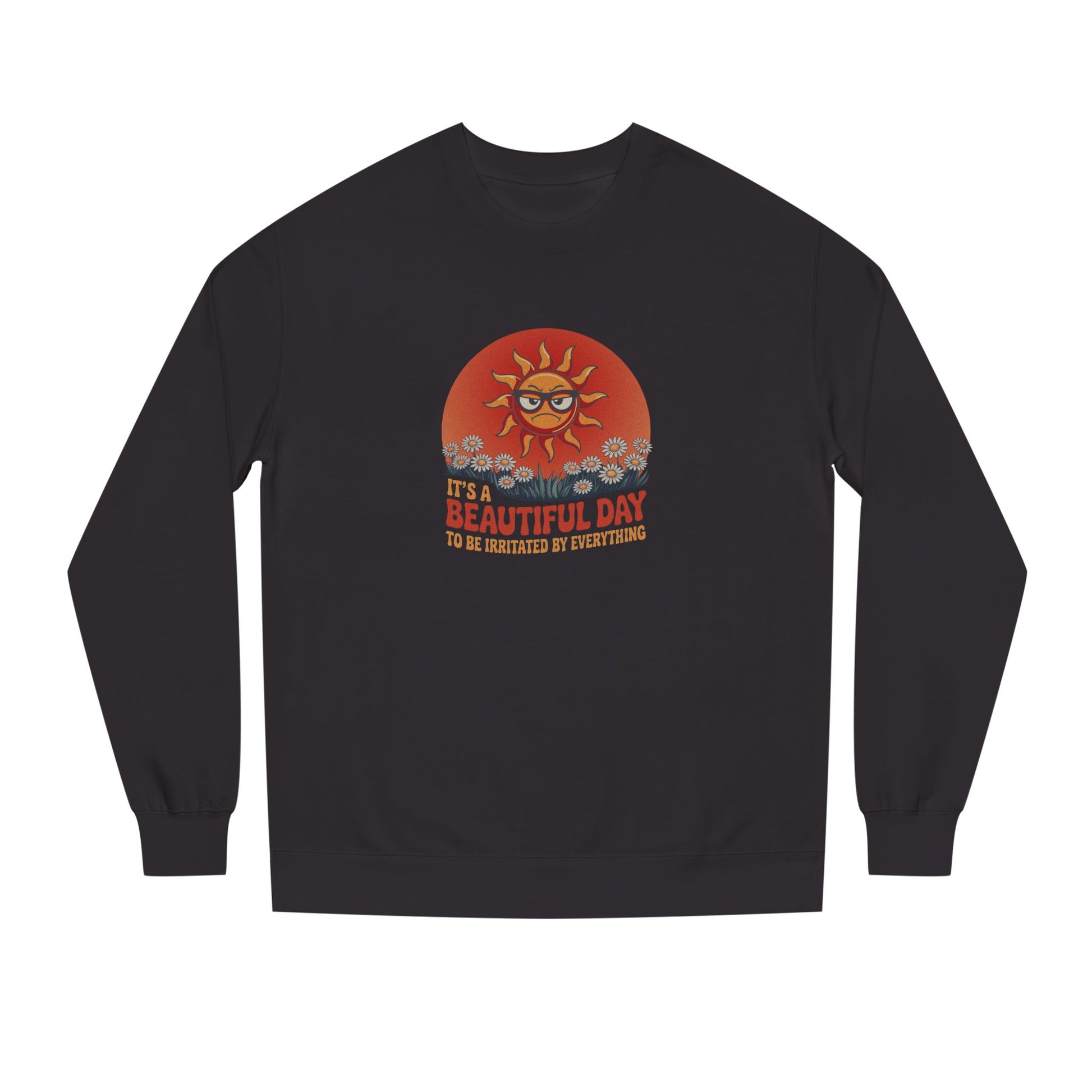 It’s a beautiful day... to lose your last ounce of patience. Some sweatshirts brighten your outlook. This one validates your bad mood and still makes you look good doing it. With vintage flair and a sun who’s clearly over it, this design brings groovy style to grouchy vibes.